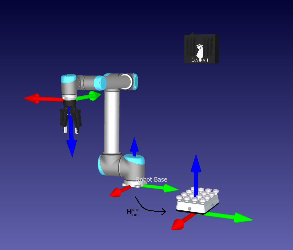 DaoAI点云是相对于DaoAI相机的坐标系给出的。在这个坐标系中,原点固定在DaoAI成像镜头的中央(内部2D相机)。机器视觉软件可以在这些数据点的集合上运行检测和定位算法。它可以确定物体在DaoAI相机的坐标系中的姿势。这个信息对于实现精确定位和抓取物体非常重要 ().