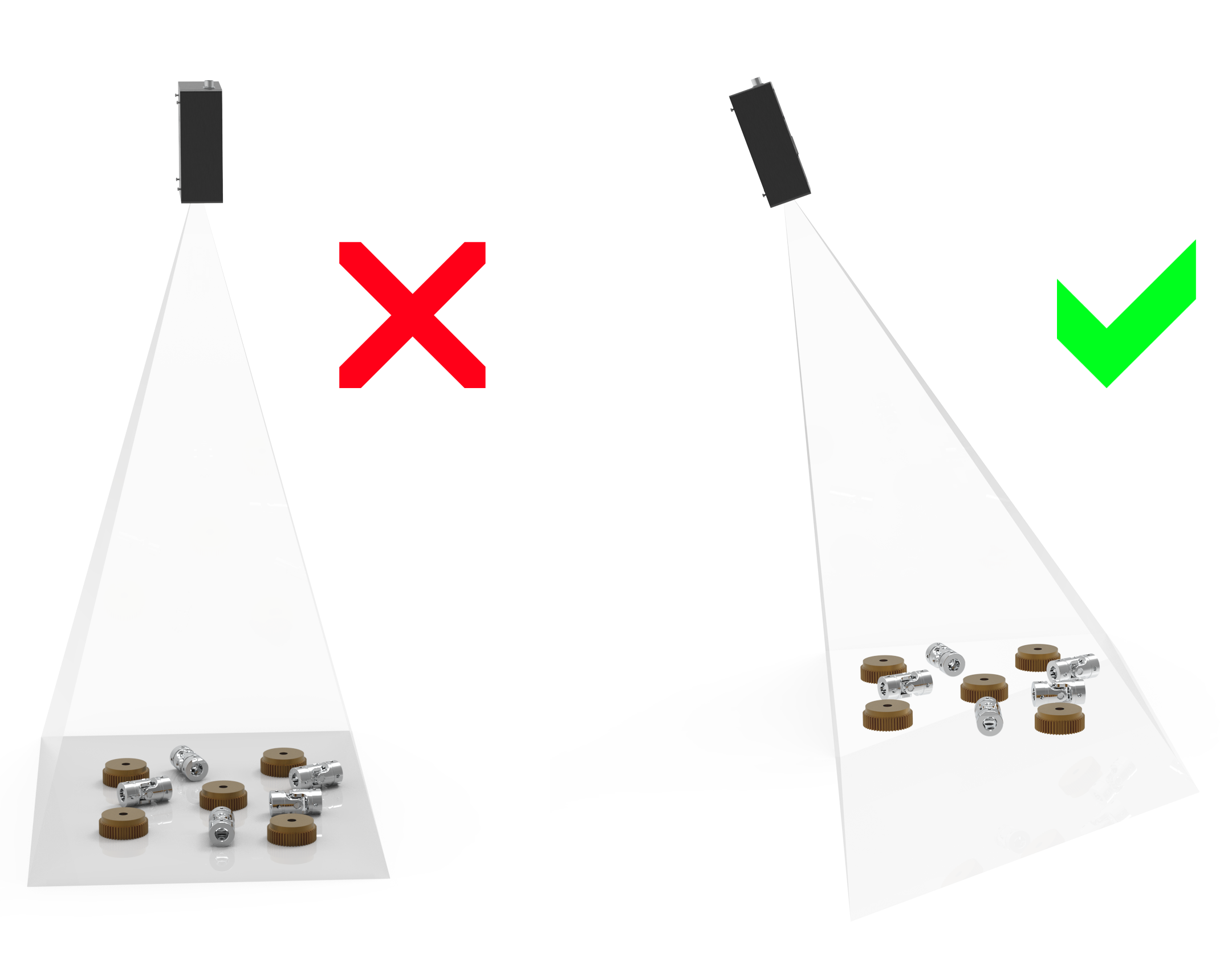 如果可能的话,将摄像机安装在一个轻微的倾斜角度,以避免背景的反射和干扰。这也为场景上方腾出了空间,方便工具和机器人的使用。请查看可用的DaoAI支架。
